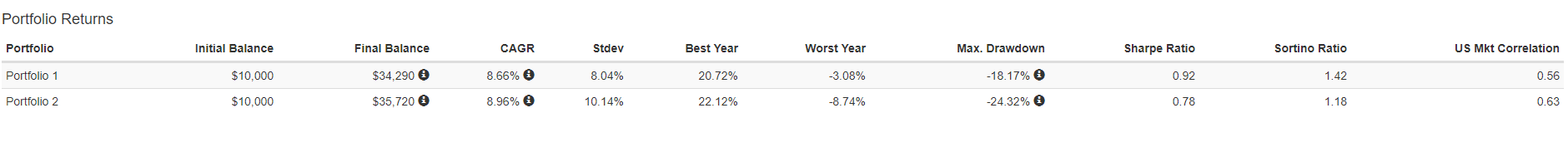 Não tendo as coisas na minha base de dados acabei por ir ao portfoliovisualizer. Portfolios 1 é o SPY/TLT, que apresenta rácio superiores. Ambos testados desde Dez 2004.
