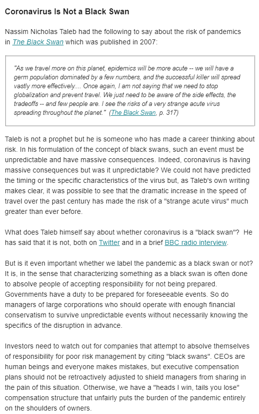 Concordo com o Taleb, este virus não é um black swan per si; mas já a situação resultante das consequências das medidas tomadas, esse sim, é um evento que ninguém estava à espera nem para o qual ninguém estava preparado. Tal como as doenças se espalham mais depressa e por àreas mais vastas, também a irracionalidade colectiva e outros fenomenos sociais e politicos de imitação se propagam à velocidade da luz.