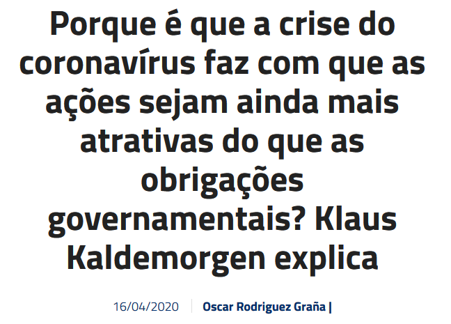 Os mercados irão agora andar ao sabor do sentimento e de noticias, as más já todos sabemos quais são, e os mercados também, aumentos de desemprego, péssimos resultados das empresas ( algumas ), de bancos, industrias, twitters do Trump ( tem sempre algo para dizer consoante para que lado da cama se levante ), as boas esperam-se com as noticias sobre a Covid-19, se já estão a baixar os novos casos e novos mortos, se já se pode abrir as economias e fronteiras etc etc.