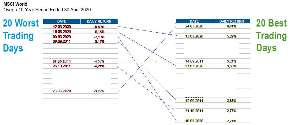 Assinalei apenas alguns das 20 piores e as 20 melhores performances do MSCI World.