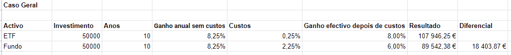 Num caso geral as diferenças podem ser diferentes de 10.949,72 €. Deixo aqui exemplo em que o ETF rendeu 8% e o fundo rendeu 6% ao longo de 10 anos com um investimento inicial de 50k