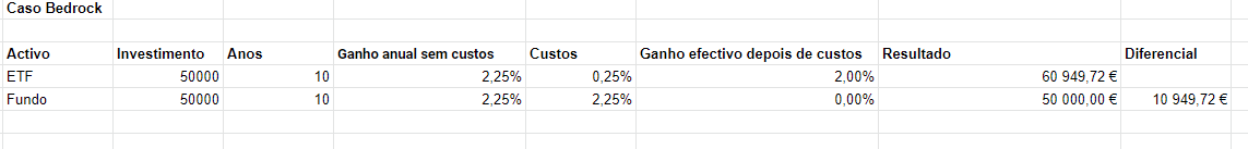 Alterei o meu excel para quem vir as contas se aperceber que a diferença é apenas nos custos e que as rentabilidades sem custos são iguais. Para tornar mais realista (ainda) incluí um custo de 0.25% ao ano para o ETF e de 2.25% no FIGA (para manter nos 2 pontos percentuais de diferença como no exemplo inicial do bedrock)