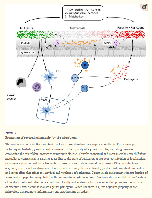 In tandem of its direct action on invasive microbes, the microbiota’s capacity to control infection is also associated to its remarkable ability to promote and calibrate both innate and adaptive immunity (Molloy et al., 2012). Indeed, commensals play a fundamental role in both the training of the immune system and its functional tuning thereby acting as adjuvants to the immune system as a whole.”