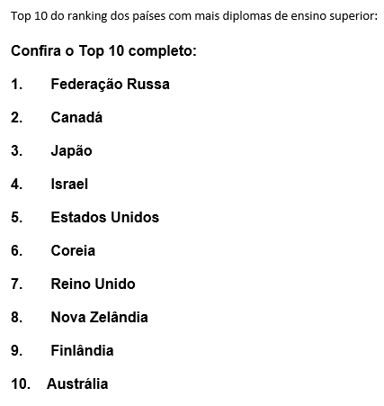 Ver a 4.ª imagem sobre o ranking dos países com mais diplomas de ensino superior.