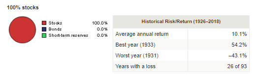 Vejam nas imagens abaixo do estudo compilado pela Vanguard, para o período de 1926 a 2018, em como à medida que aumentamos a % de ações alocadas vs % de obrigações, isso implica sempre, no referido time frame, uma maior média anual de retornos. Historicamente, a alocação com obrigações só pode interessar para o curto-médio prazo.