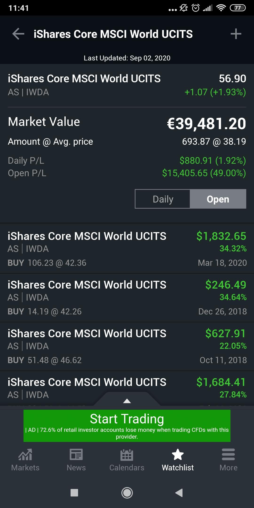Total de 693,87UPs a um preço médio de 38,19€, estão o ETF MSCI World actualmente cotado em 56,95€.