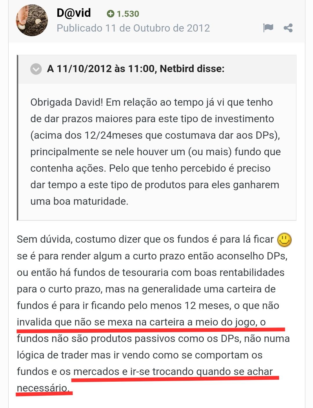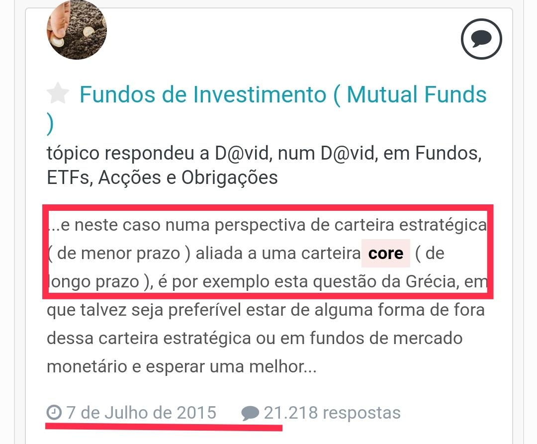 Antes de 2012 andava no fórum Caldeirão da Bolsa e comecei a falar em usar FI para múltiplas estratégias de investimento (que não eram faladas em mais nenhum fórum, aliás nem os jornais económicos falavam de FI, foi devido à minha participação que o JdN começou a falar de FI ;)), que eram não só para o Buy N' Hold de 90-100% de FI Obrigações PIMCO e Templeton (já quase ninguém fala do PIMCO TR e do Bill Gross). Criando um tópico com um top dos melhores FI de cerca de 100 FI para várias estratégias, introduzindo várias ferramentas de gestão e de seguimento de carteiras de FI. Com estudos económicos, de classes de activos, países, sectores, etc. Foi grande êxito (1,7 milhões de visualizações em 5 anos, apenas os 2 primeiros anos com actividade regular da minha parte), que eu deixei morrer por achar que os FI já tinham muito pouco para me ensinar, e parti para outros voos mais altos, para mais instrumentos financeiros mais exigentes e que poderiam oferecer melhores retornos.