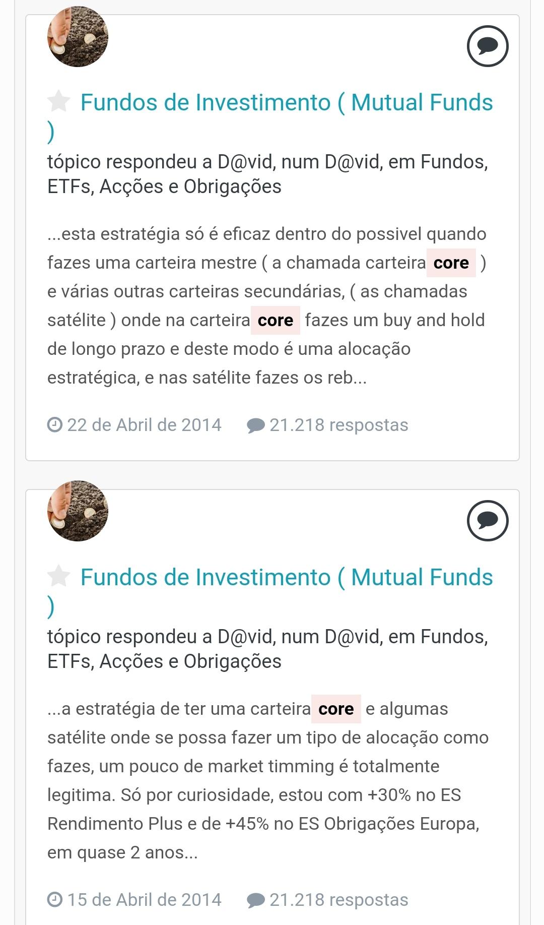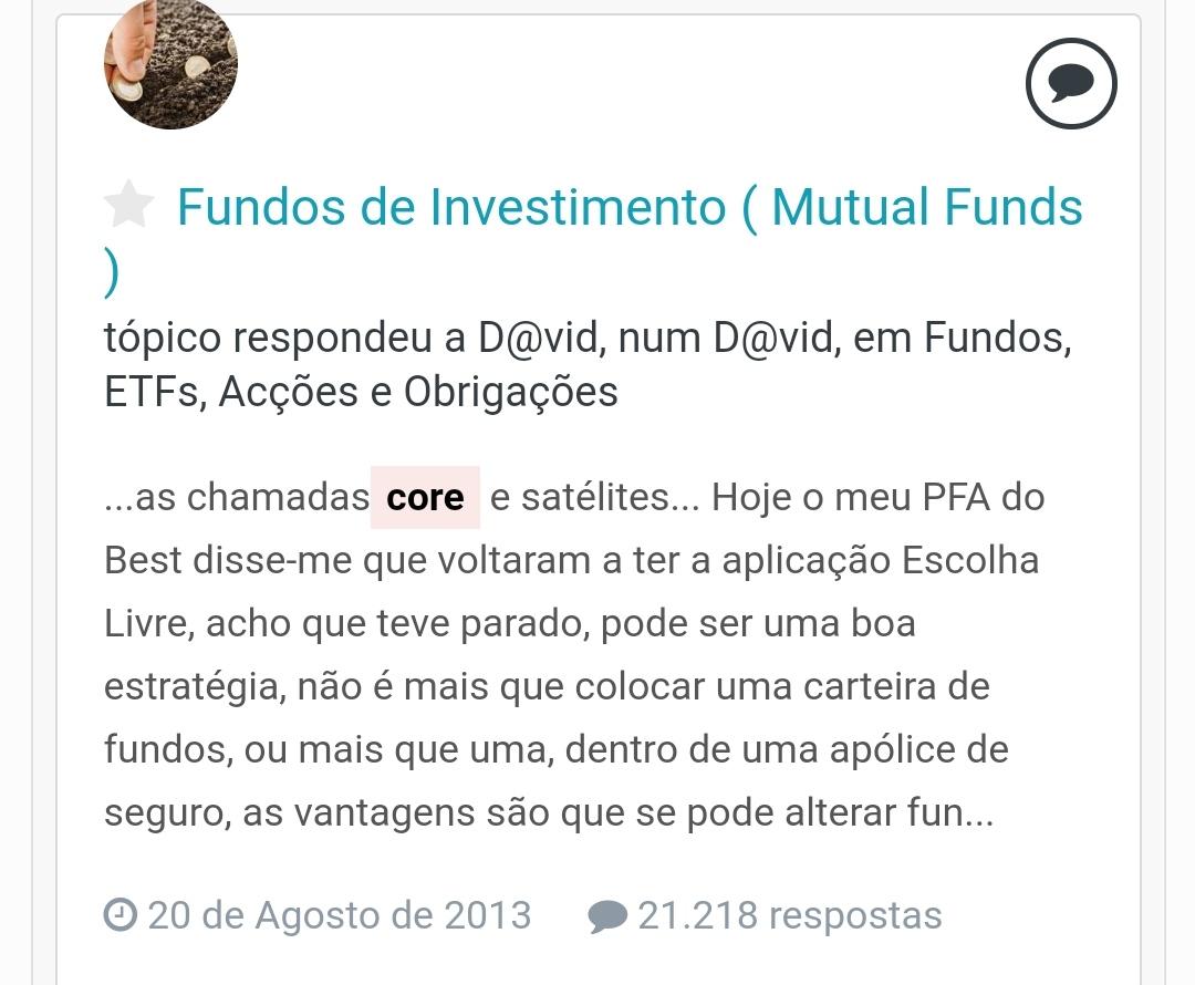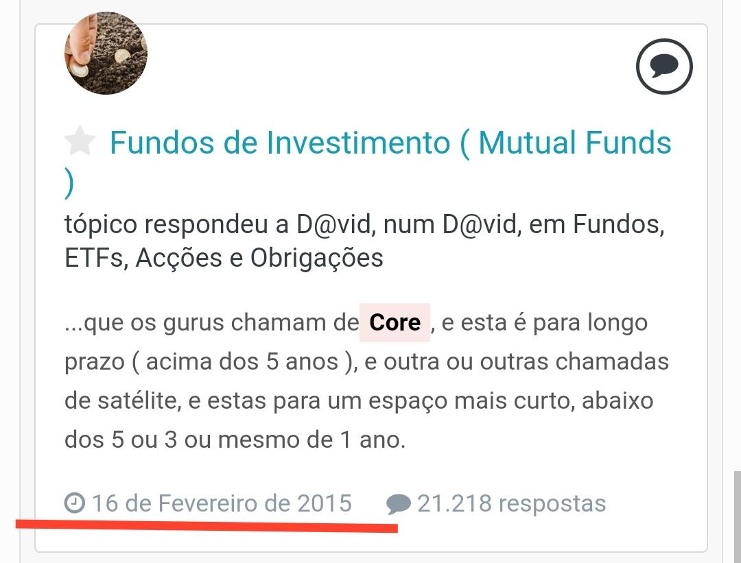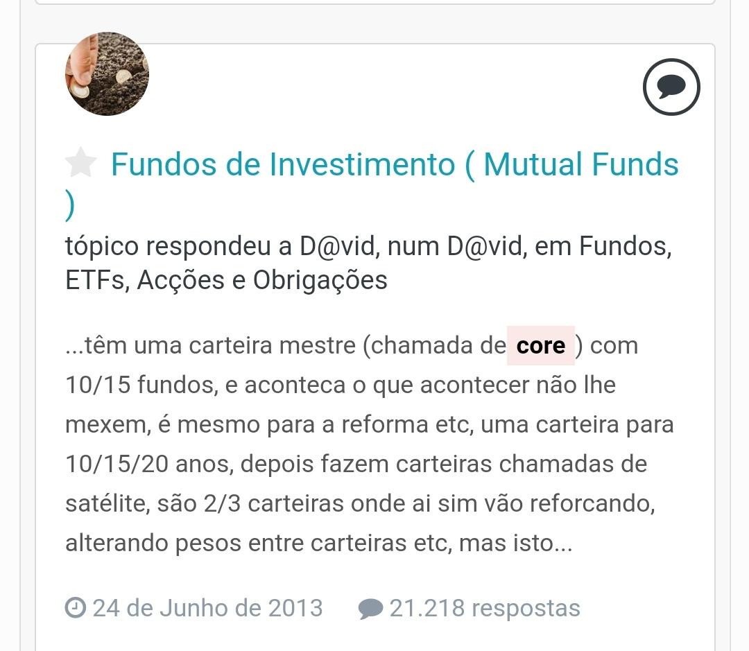 O que não falta sou eu a falar em carteiras Core e Satélite ?? @Rick Lusitano quando eu criei o tópico já levava mais de 8 anos de investir em fundos, mas o BPI Brasil ( o meu primeiro fundo ) tenho ideia que o tinha feito ainda antes do Euro 2004 ? ( sim eu em muitos momentos da minha vida tenho como referência esse evento, é do tipo da pergunta do Batista Bastos " onde estava no 25 de Abril" ?) por isso acho que ainda foi há mais tempo, nem fóruns nem livros nem notícias eu via sobre fundos, provavelmente culpa minha ?.