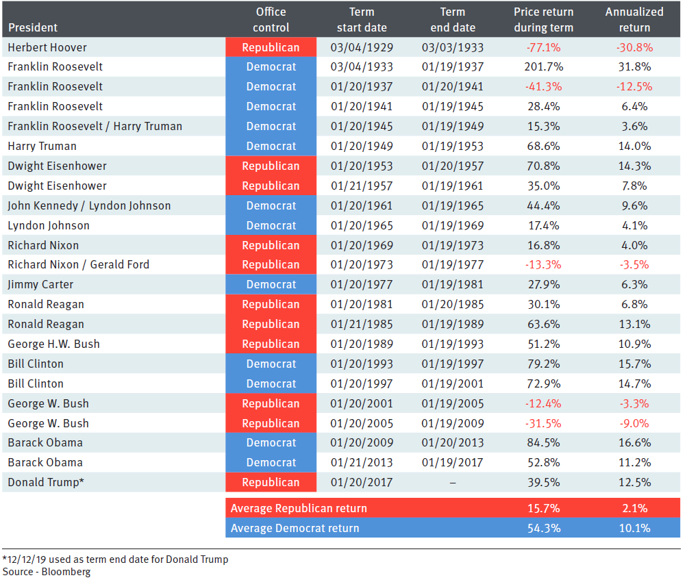 "At this point of the juncture, it is too early to determine which party will win the election. The important question for investors is how the markets will react when election results come in. Some are concerned that a Democratic president would not be as favourable to the equity markets, compared to a Republican. However, the returns of the S&P 500 since 1929 show otherwise. The data has shown that Democratic presidents actually witness stronger returns".