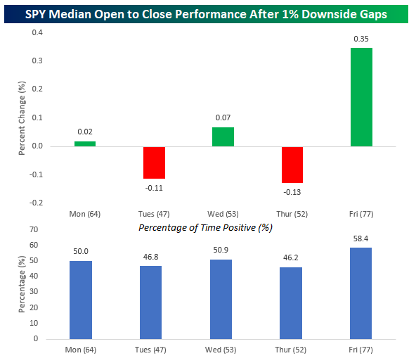 The S&P 500 is poised to open down about 1.5% this morning, and below we have summarized the typical performance of SPY from the open to close following downside gaps of 1% or more.  On the 64 days since 1994, that these downside gaps have occurred on a Monday, SPY's median performance from the opening to closing bell has been a gain of 0.02% with positive returns half of the time.  In other words, it's basically a coinflip.