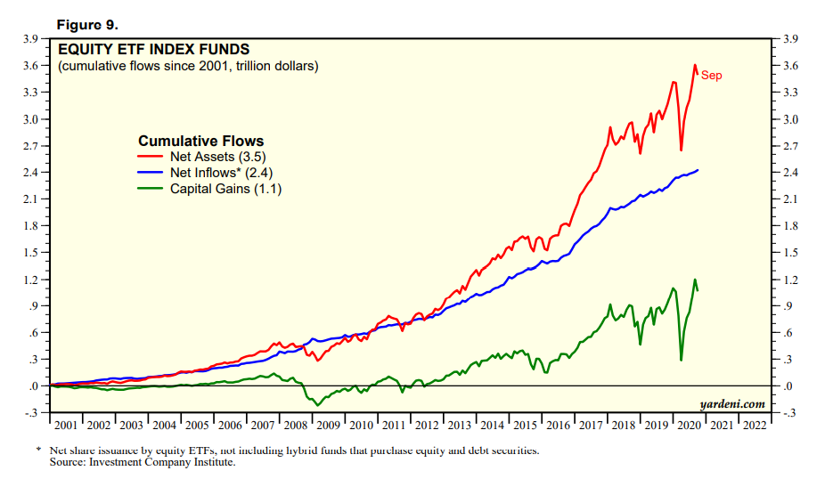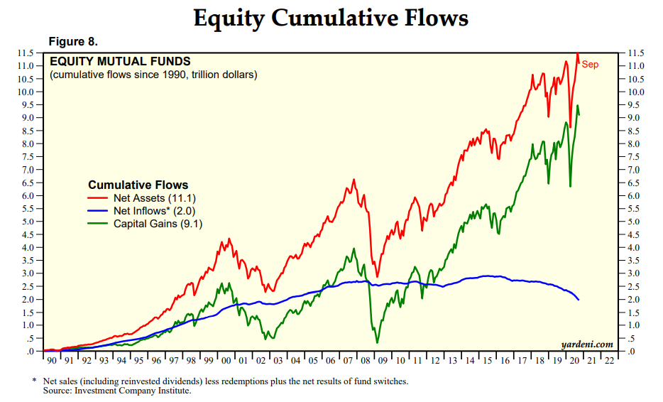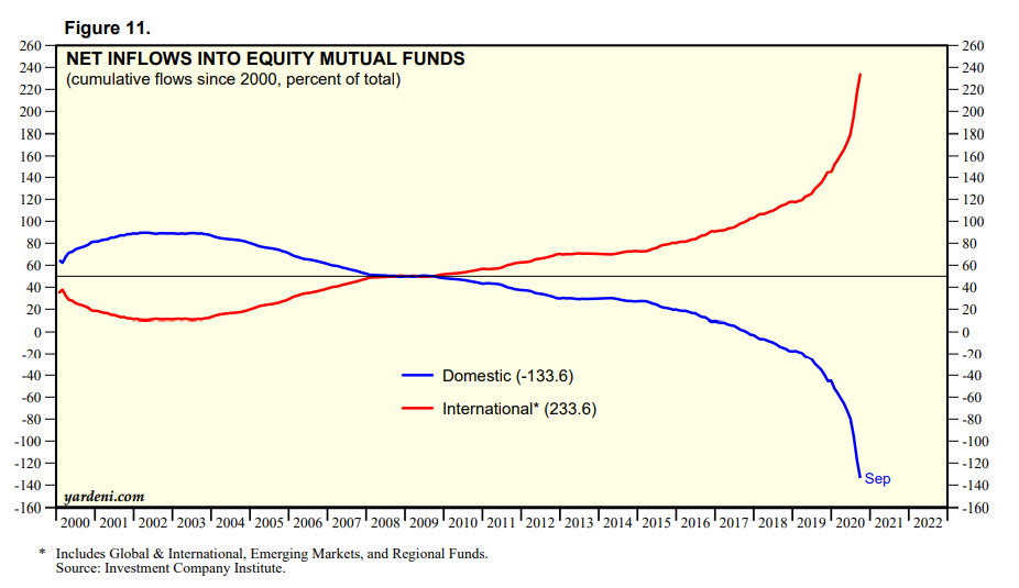 Alguns gráficos abaixo, para o reset de certas mentes, referentes a fluxos de mutual funds e ETFs nos EUA (domestic) e fora dos EUA (international) de ações, ao longo dos anos até setembro de 2020.