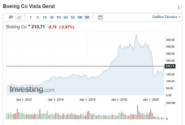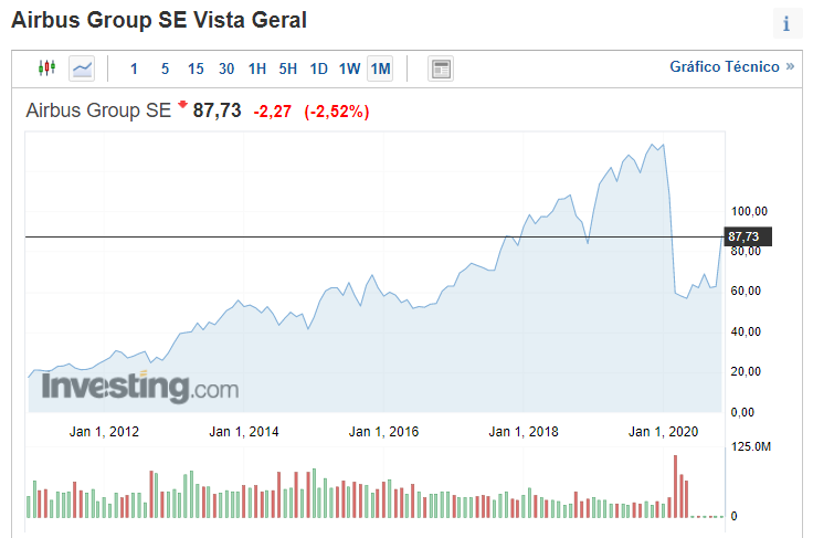 Por falar em ativos "pandémicos" (mais esmagados pela pandemia), como os ativos dos setores da aviação, turismo, hotéis, restaurantes, viagens, lazer, ..., e para quem gosta de apostar individualmente em acões, eu entrava preferencialmente na aviação, não nas companhias de transporte aéreo mas sim nas 2 principais empresas/grupos construtores de aviões (ver gráficos abaixo), pois estes 2 ativos estão expostos às companhias de transporte aéreo de todo o mundo, suas clientes, e assim serão menos voláteis que as empresas áreas individualmente, para além de que não gostei da análise gráfica comparativa que fiz destas últimas em confronto com aquelas 2 empresas construtoras.