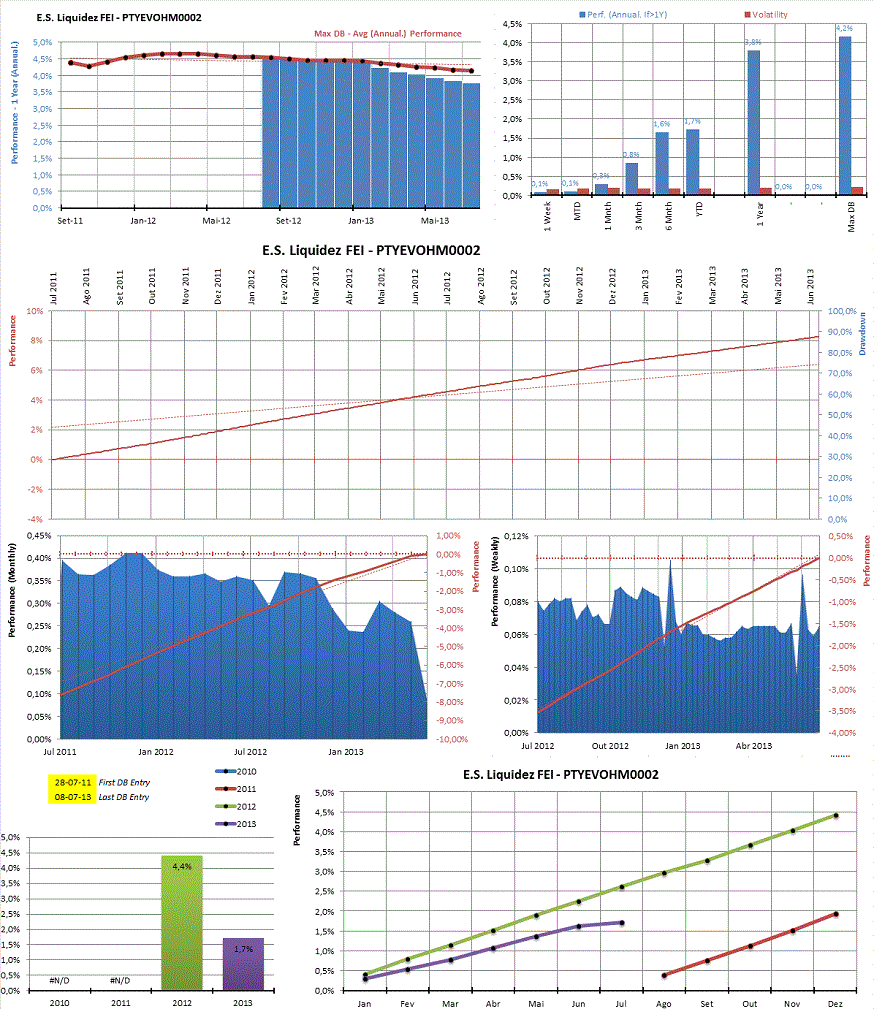 Indicação da rentabilidade obtida em cada ano, acumulado mensal - apresenta 2011 limitada, por a base de dados iniciar em 28/07/2011, e 2013 até á data actual.
