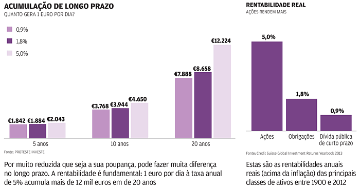 A diferença entre ganhar 5% ou 0,9% é crucial no longo prazo. Um euro aplicado diariamente numa aplicação que renda 5% por ano (como renderam as ações nos últimos 113 anos) acumula 12 224 euros em 20 anos, por exemplo. Um investimento que dê 0,9% por ano (como as aplicações de baixo risco desde 1900), acumula 7888 euros no mesmo período. A confirmarem-se estas rentabilidades históricas no futuro, arriscar gera mais 55% de poupança em 2 décadas.