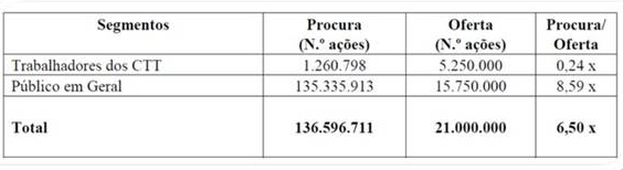 "Procura no público em geral supera em 8,6 vezes oferta de acções na OPV dos CTT "
