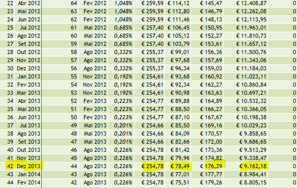 Repara no mês de dezembro que eu sublinhei, tens mais ou menos 255€ de prestação (muito perto do que supostamente tens) onde uma parte é de capital (176€) e uma parte de juros (78€) e o valor do capital em dívida de 9.162€, não muito longe do que tens.