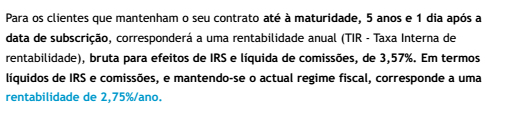 A taxa média bruta é qualquer coisa como 3.57% para os 5 anos. Em termos líquidos não sei bem dizer, pois eles usam uma forma um pouco obscura para devolver o capital, e em cada ano paga-se menos impostos sobre os juros do que os 28%. Ao fim dos 5 anos e 1 dia há a taxa irs reduzida, logo é mais um factor de confusão de cálculos.