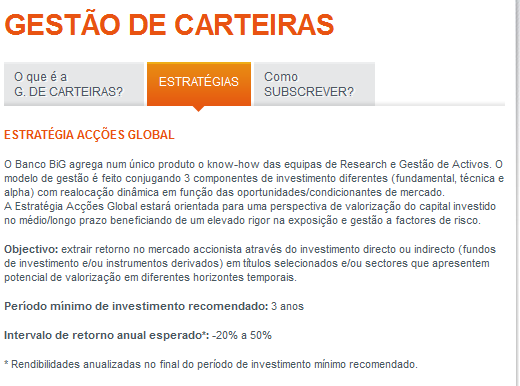 Pelo que sei existe apenas uma carteira nesse serviço do BiG, minimo de 25k e com alocação em Acções, não sei quem é a gestora que gere ou se é o próprio banco.